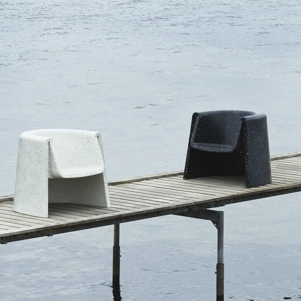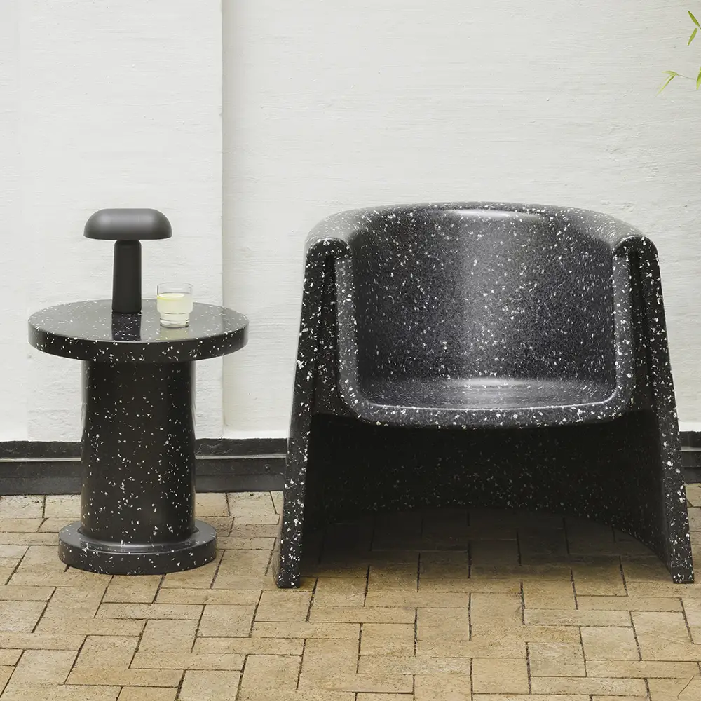 Bit Lounge Chair is made up of small bits of recycled household and industrial plastic waste. An innovative material composition that offers a distinctive, pixelated expression and a durable surface.