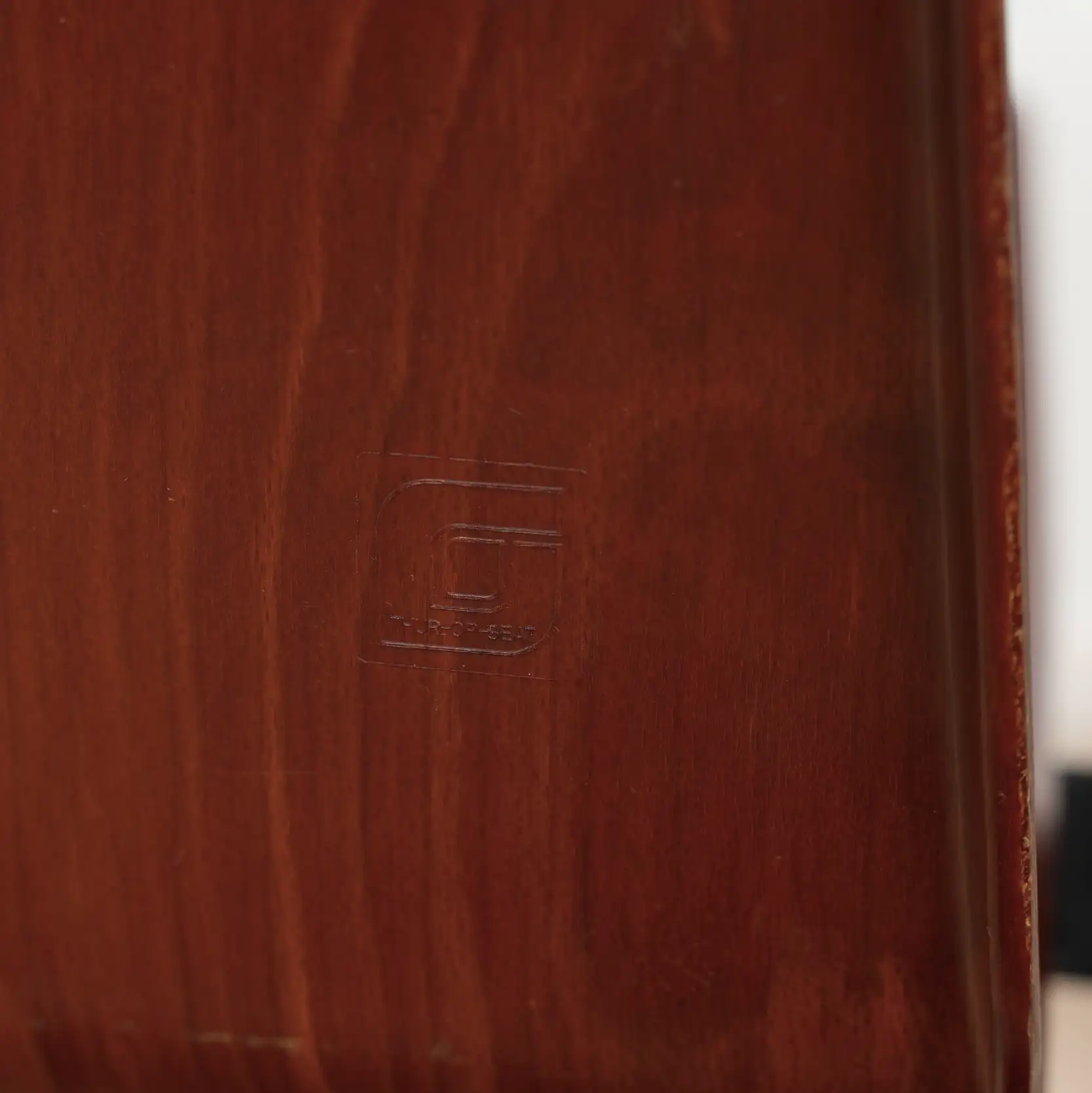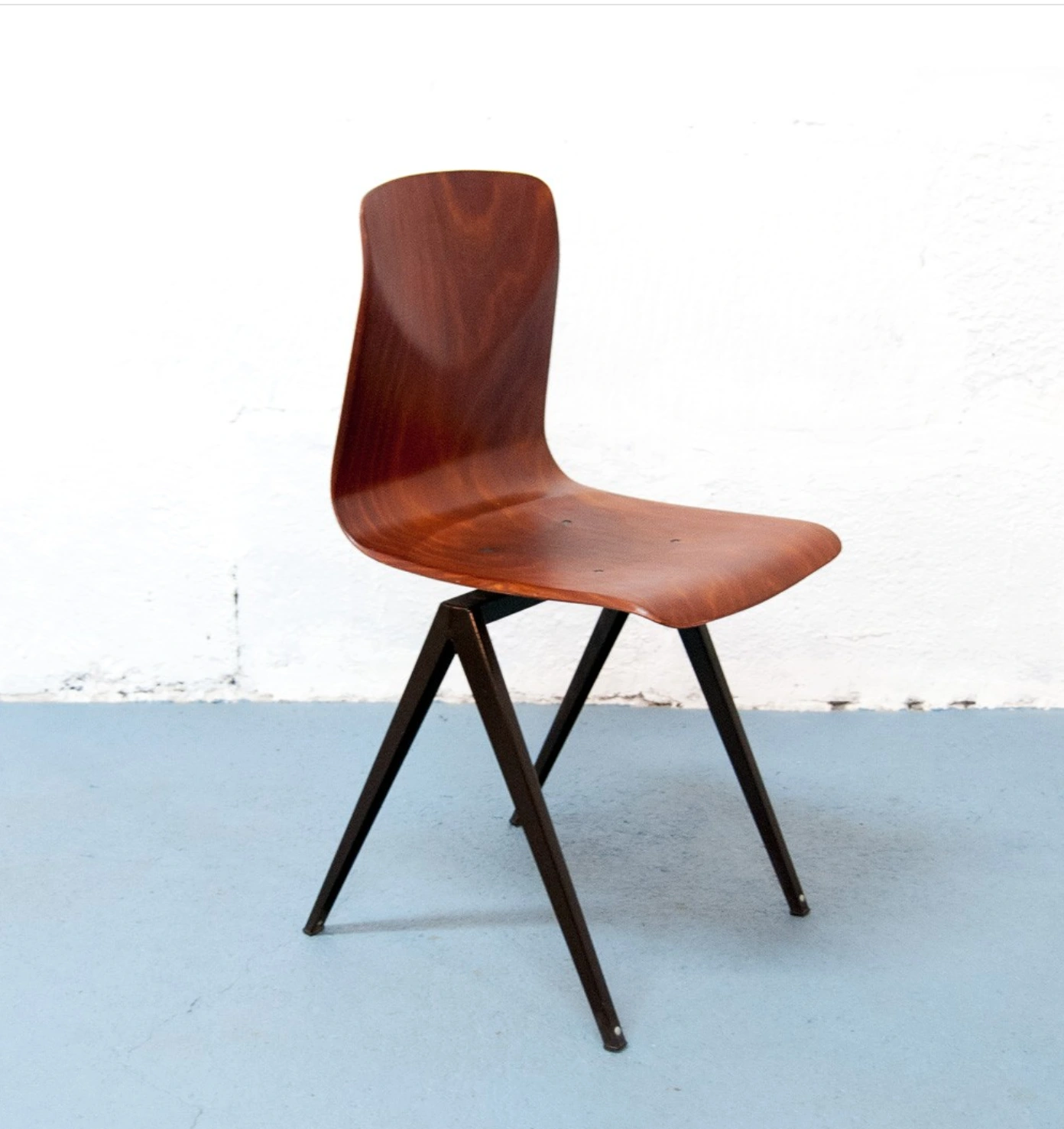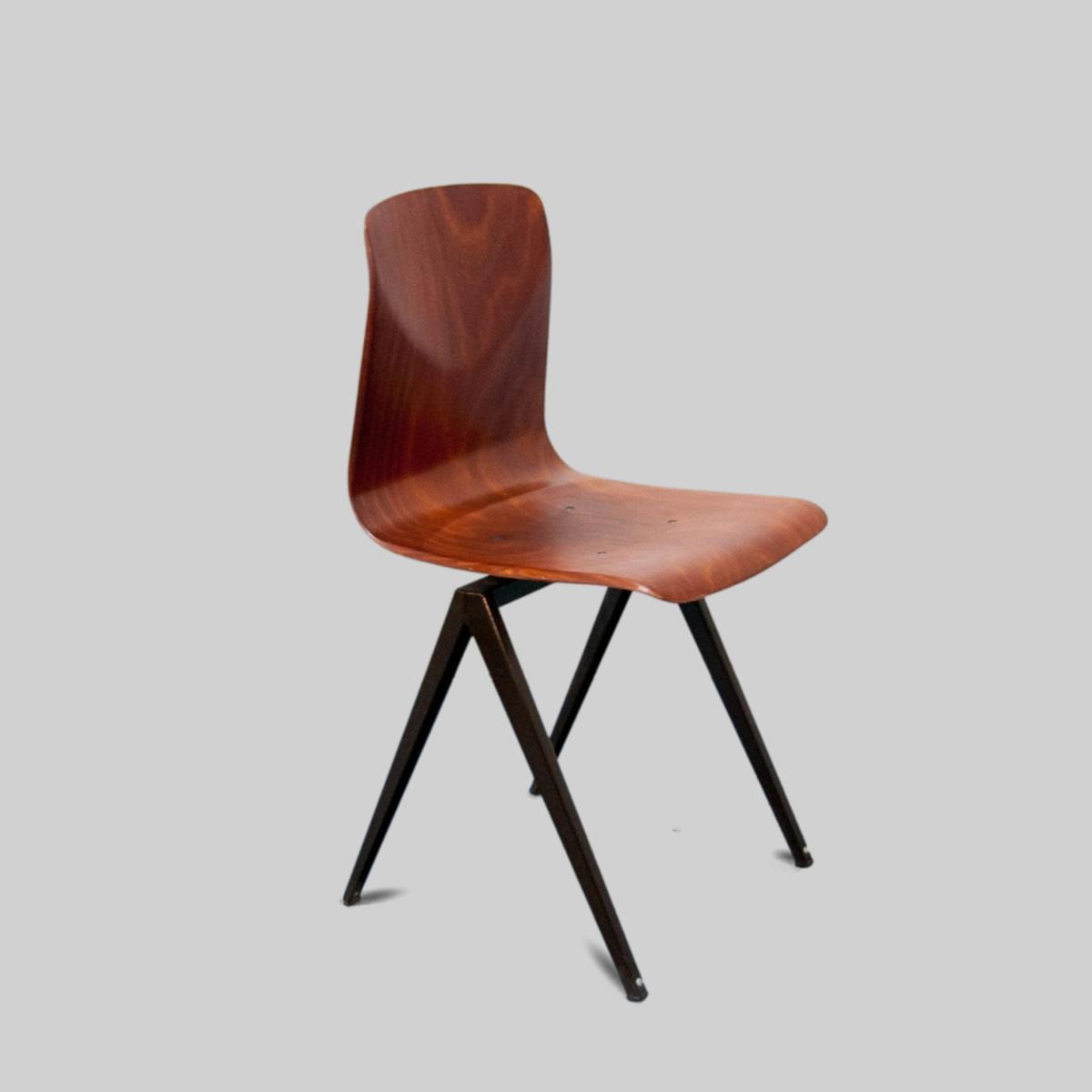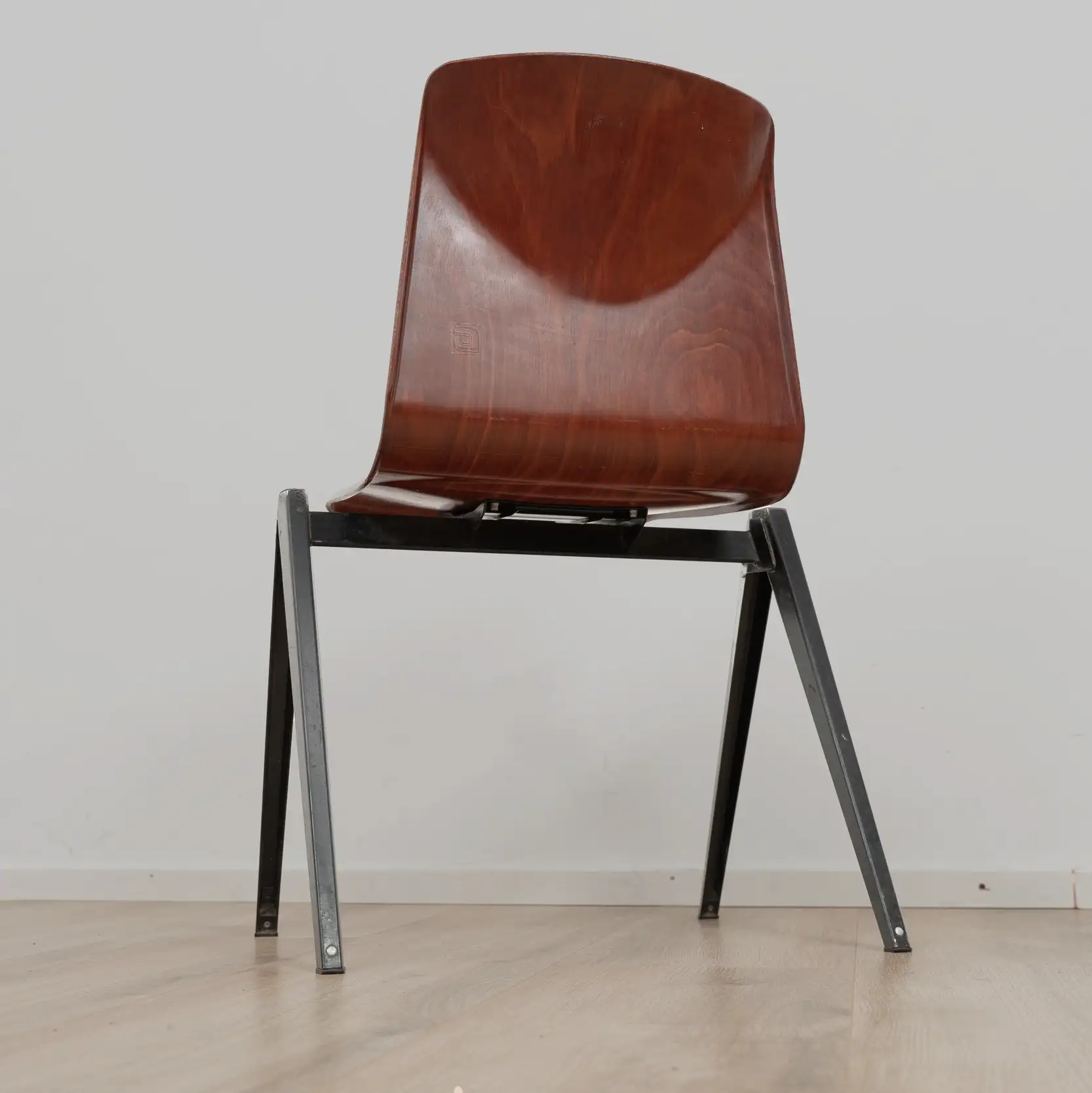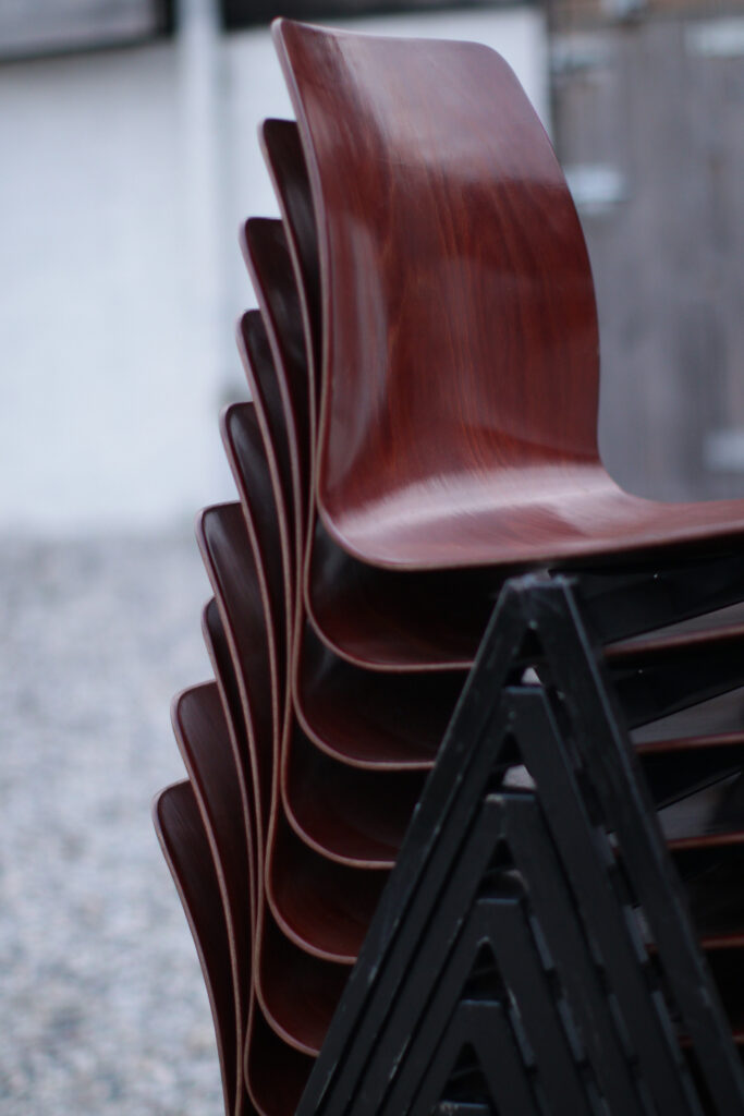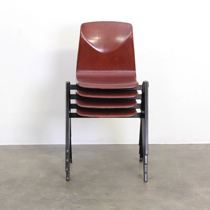 Designed by Elmar Flototto and manufactured by Pagholz and Galvanitas, the red-ish brown seat and back consist of one piece called pagwood: It is formed by fusing plywood with resin, which gives the beauty of a natural product but with improved durability and stain resistance. The V-shaped frames are made of folded sheet metal, ending in rubber feet. Very solid and a revolutionary design from the 1970’s the chairs are marked with the characteristic Thur op Seat logo. They have a nice patina from several years of usage which gives them a nice industrial look.