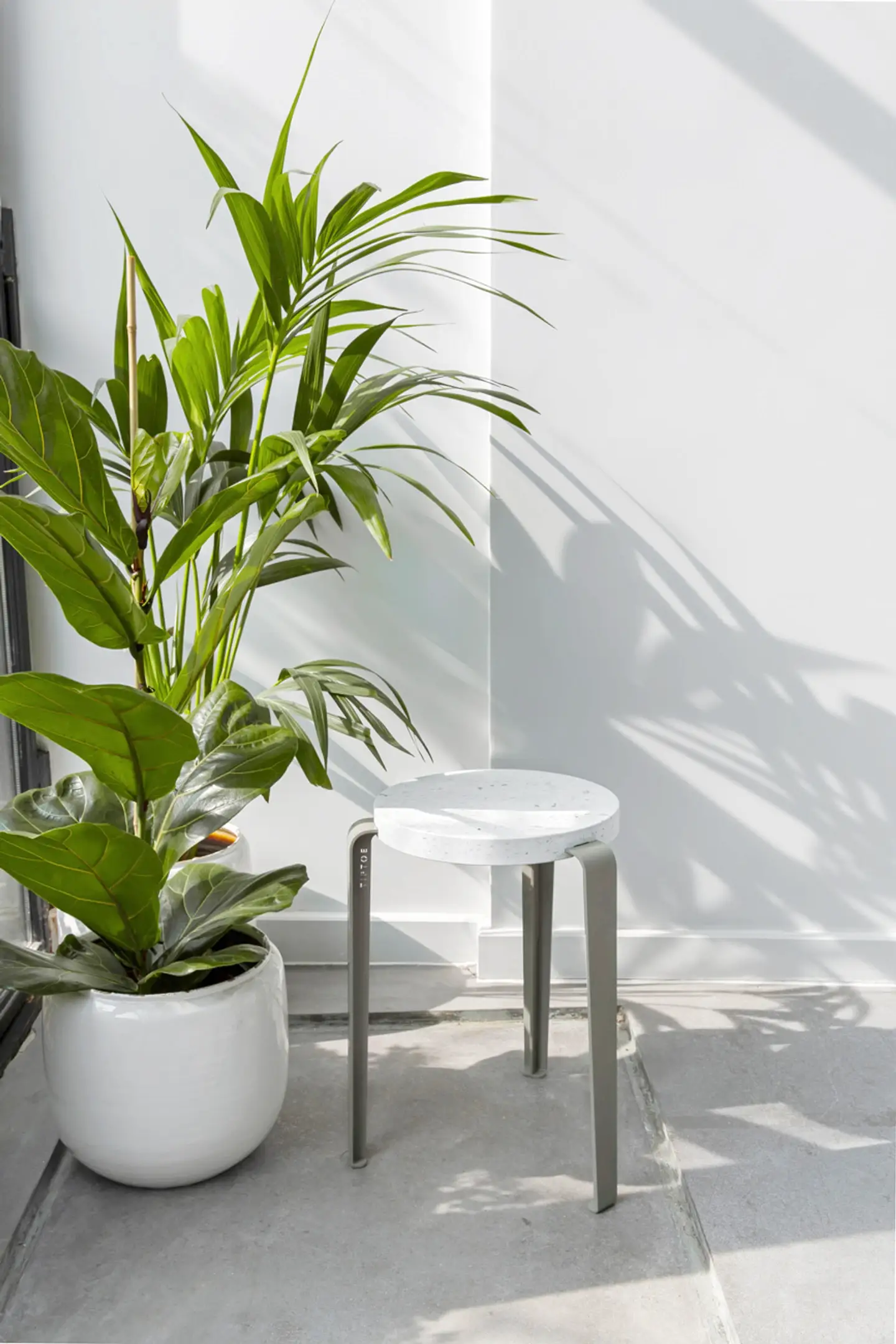 Its recycled plastic seat is made from yogurt cups. The colorful chips on the surface of the stool are clues to the past life of the plastic.