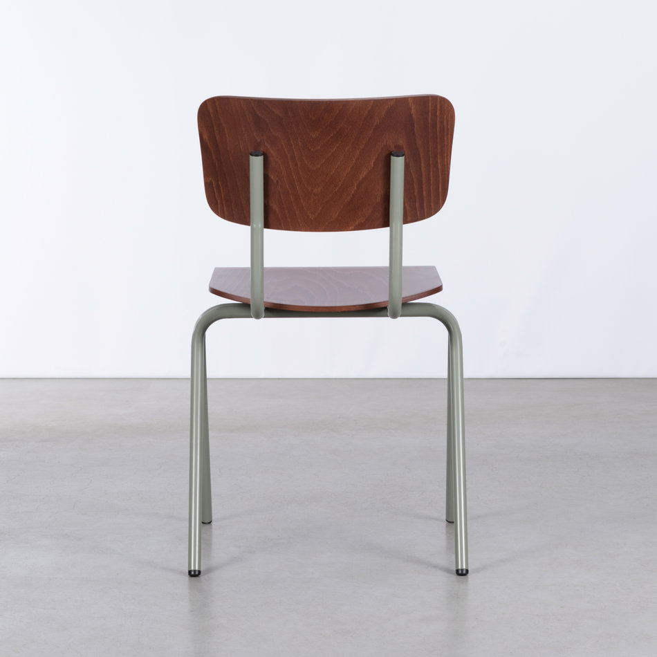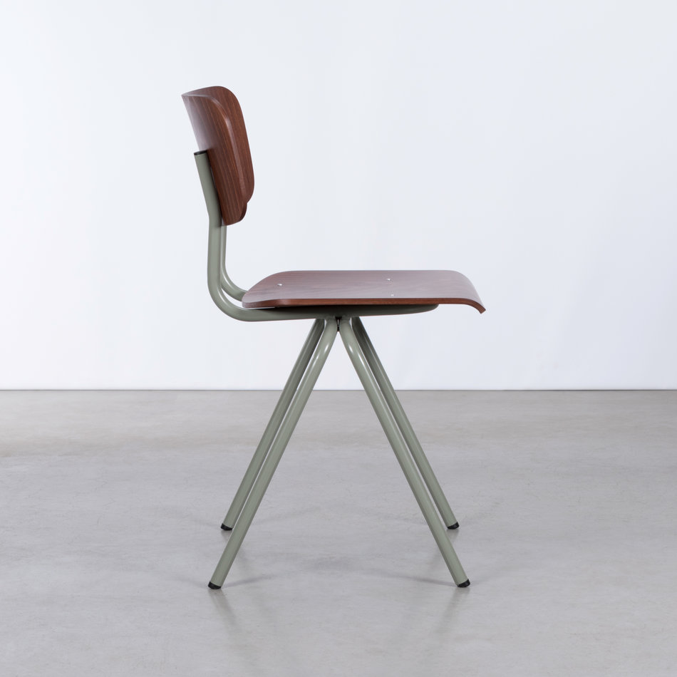 The compass-shaped legs stand diagonally under the seat and give the chair a stable base. The red-brown plywood seat and backrest are mounted on a mint-grey tubular frame. This chair of timeless design is great for the living room, the dining table or your office.