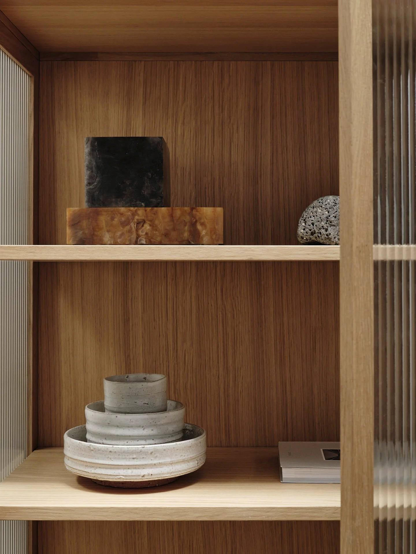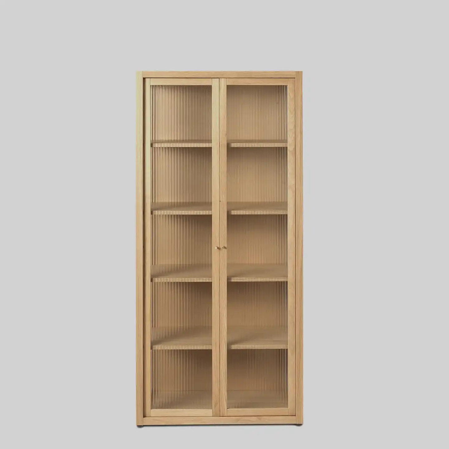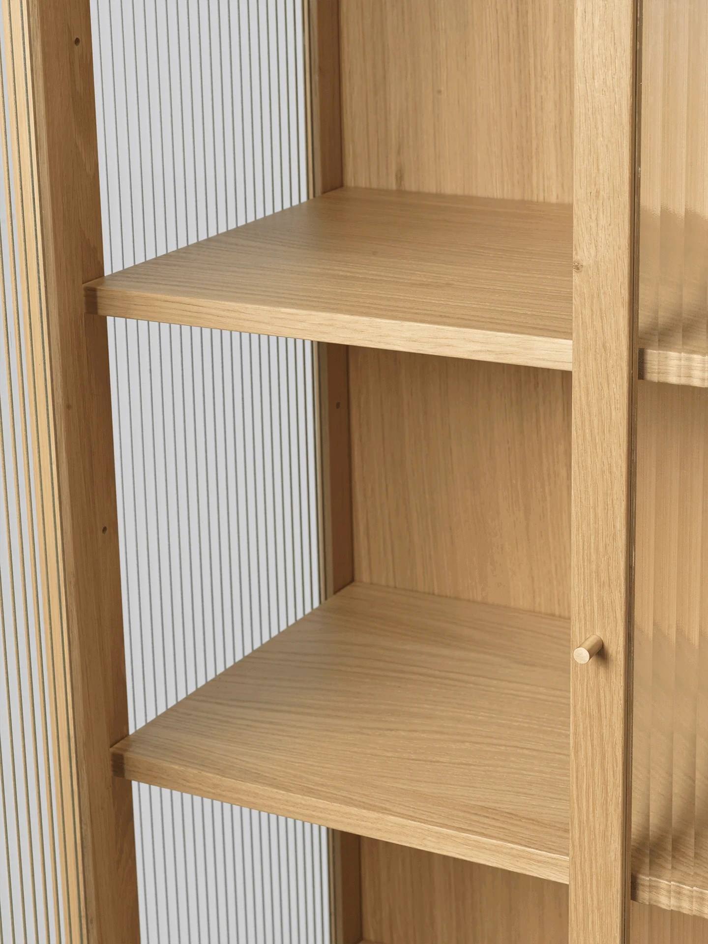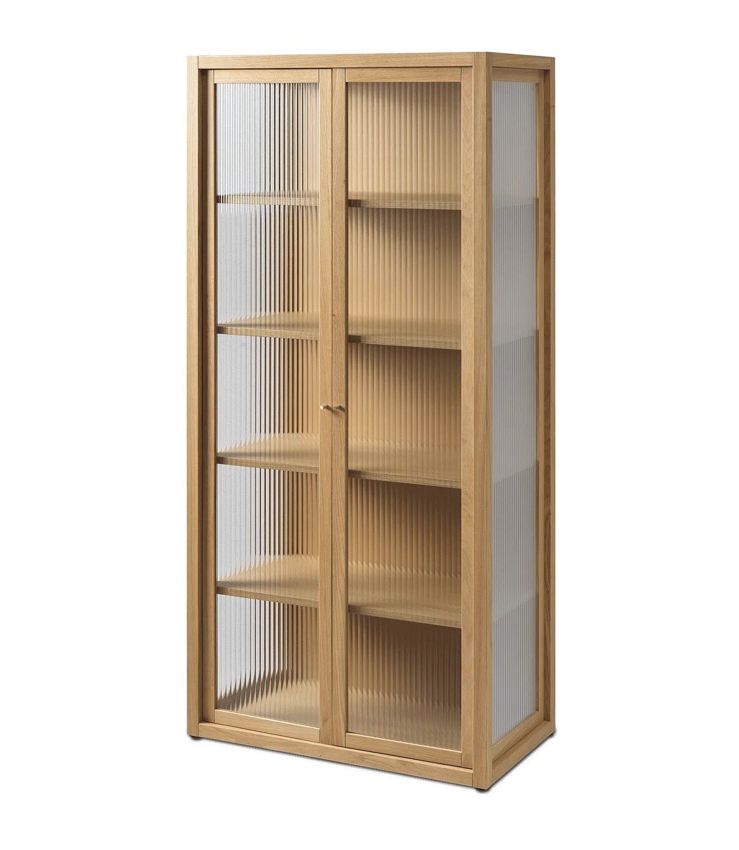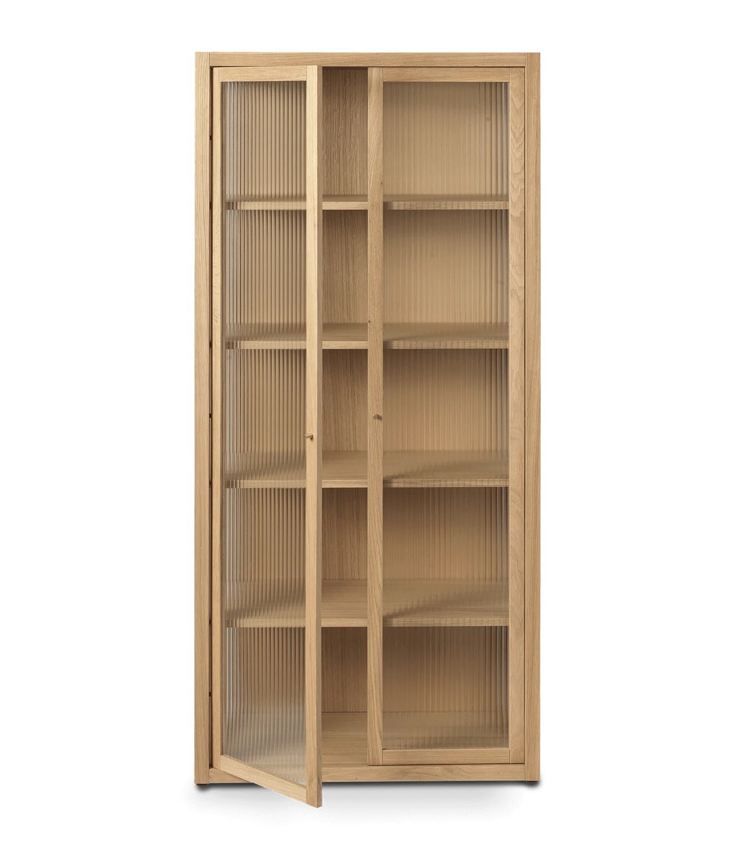 Combining meticulous craftsmanship with timeless design, this sophisticated piece takes its name from the reeded glass doors that add texture while subtly obscuring its contents. Solid brass handles enhance its elegance while complementing the natural warmth of the oak. The Reed vitrine offers ample space for books, ornaments, and cherished items and adapts seamlessly to various interior styles, making it suitable for kitchens, dining rooms and living rooms.