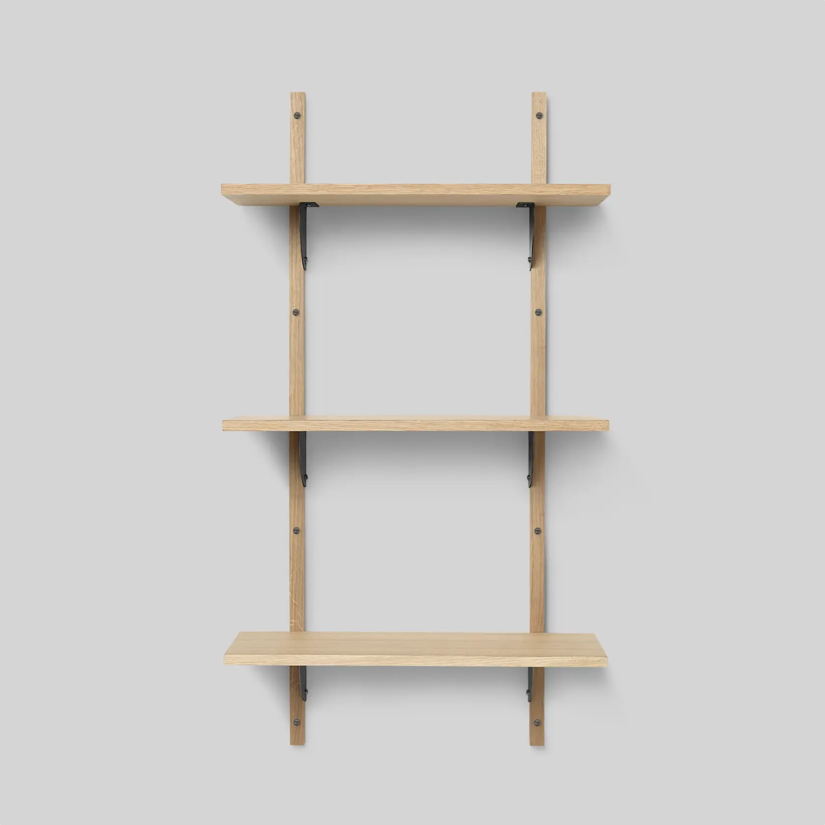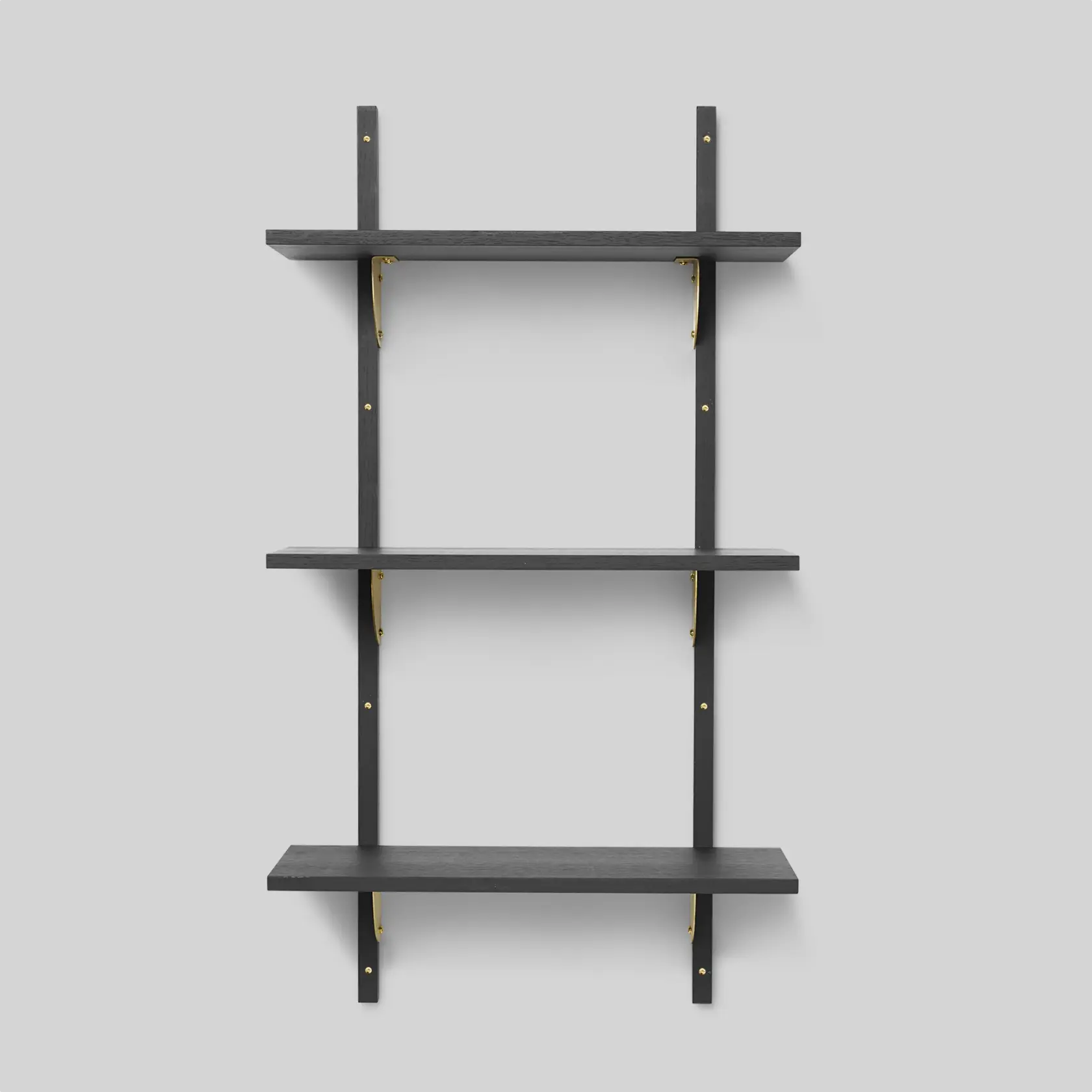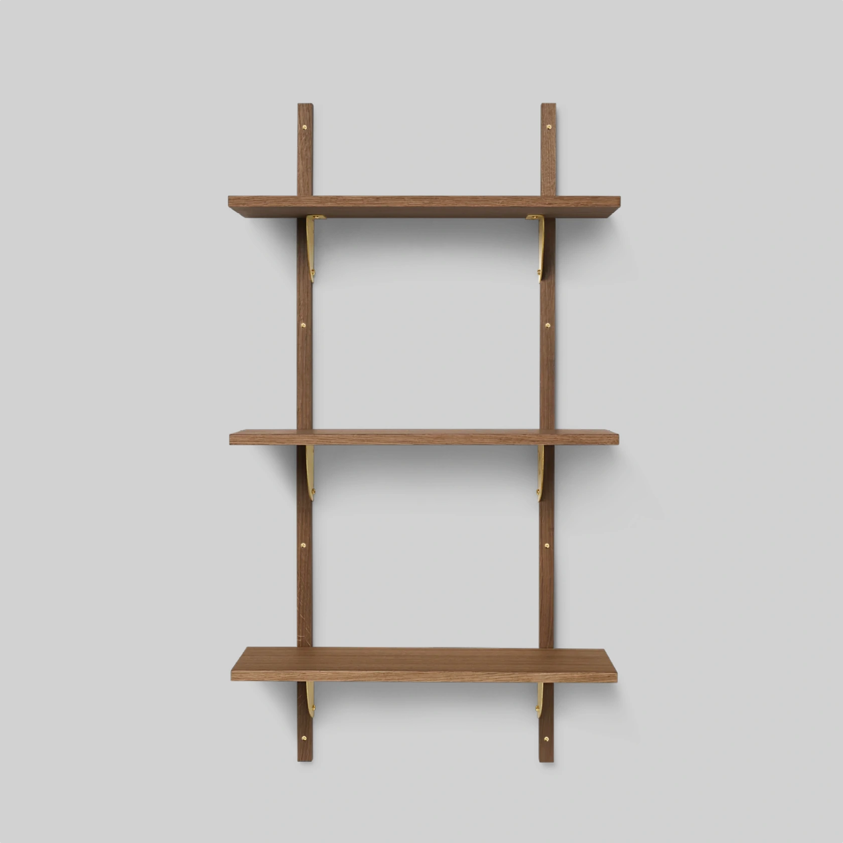 A new and modern take on Mid-century shelving units, Sector is defined by its sturdy simplicity and classic combination of wood and brass – available with natural and smoked oak veneer, or black stained ash veneer shelves, and polished brass or blackened brass brackets.