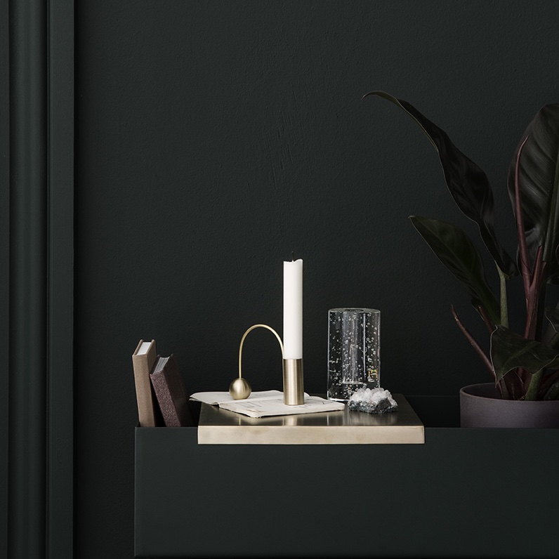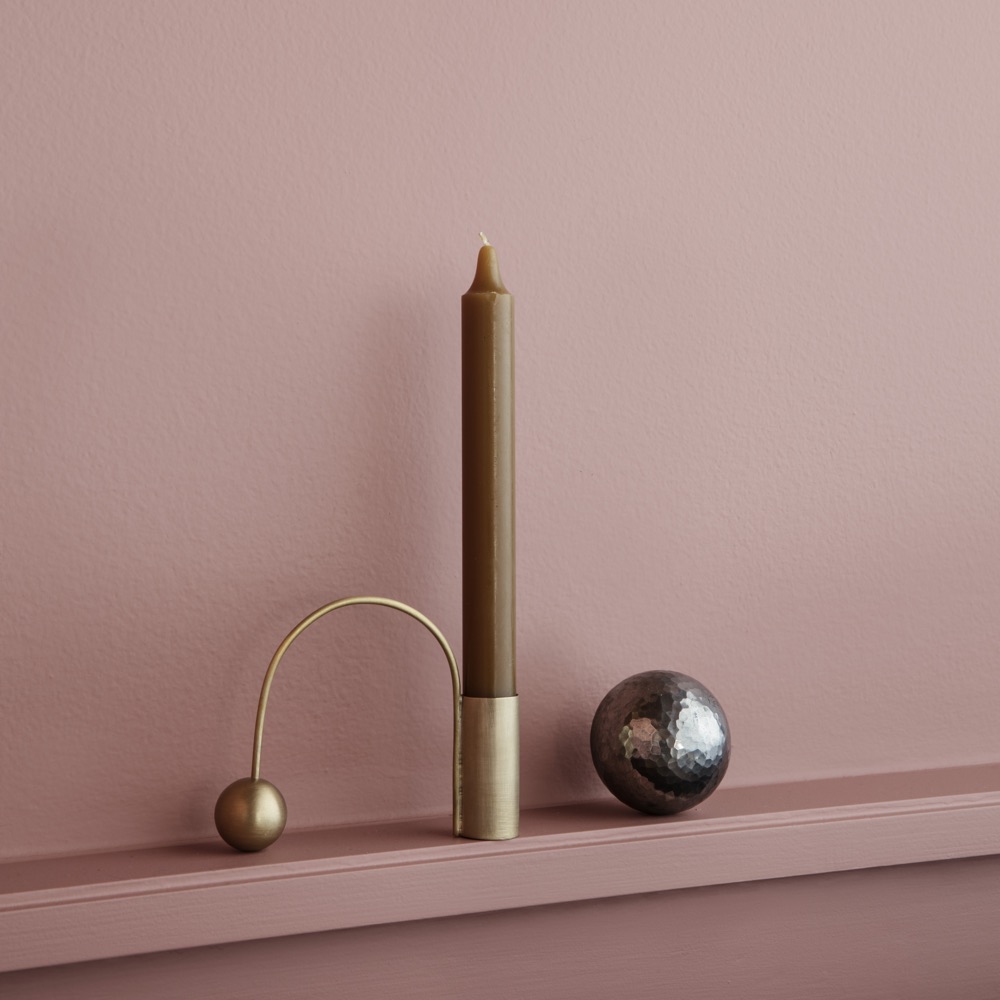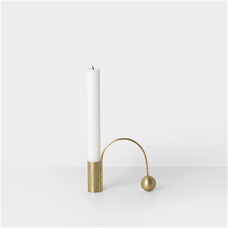 The geometrical shapes are both sculptural and functional elements, as the arch may be used as a handle to carry the candle holder.
