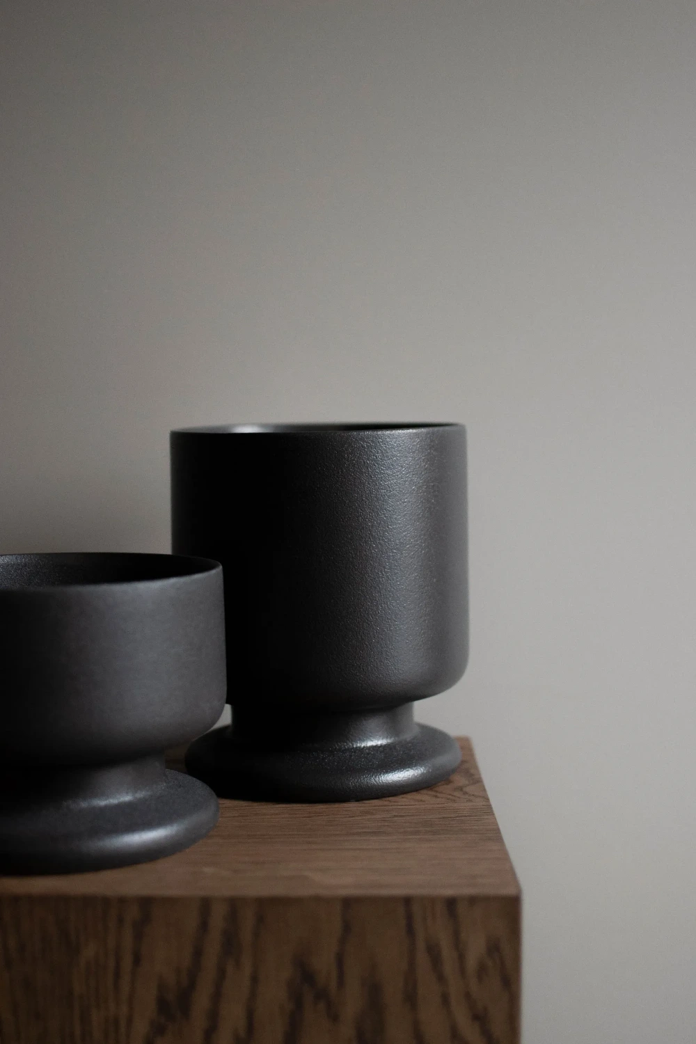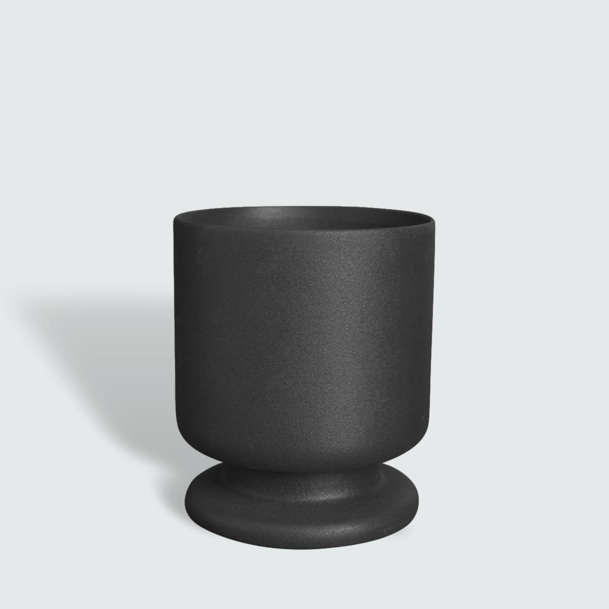 This pot has an elegant design in ceramic with a cylindrical shape and an elegant foot that resembles a classic silver cup in a slightly softer form.