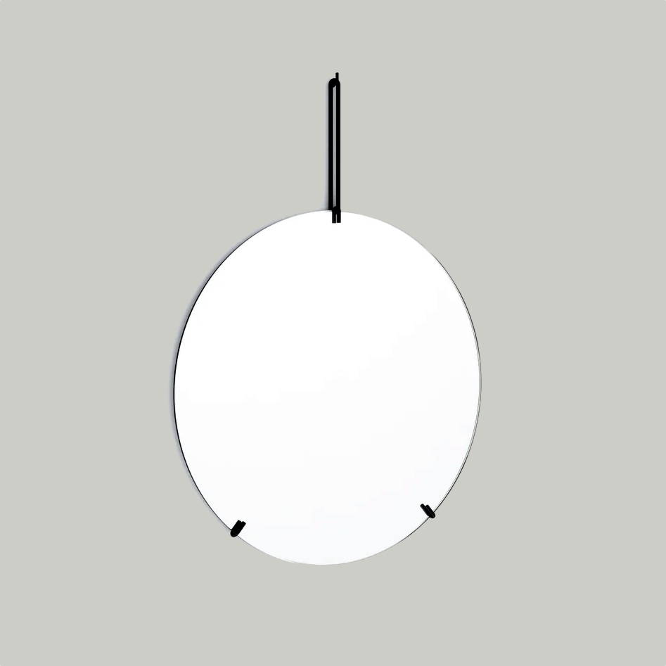 The mirror is kept simple, leaving the core function – the mirrored glass – to speak for itself. Held by a lightweight metal wireform which hangs from a simple L hook mounted to the wall, the construction itself provides a subtle detail for those who really look.