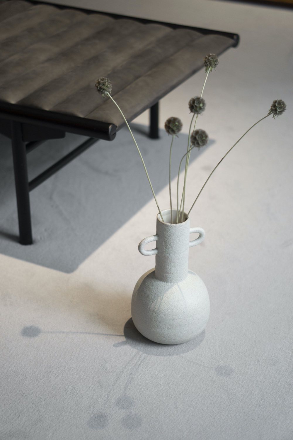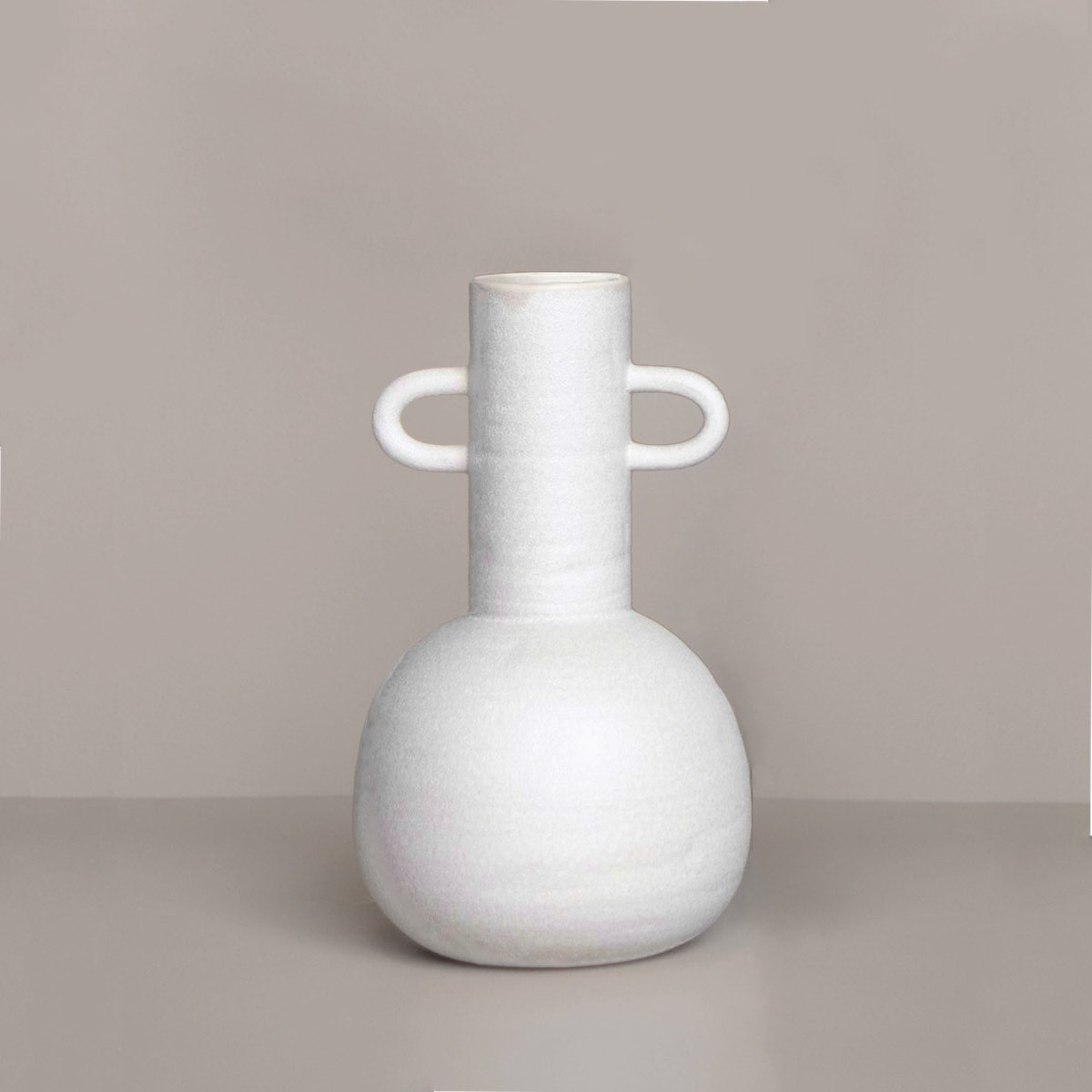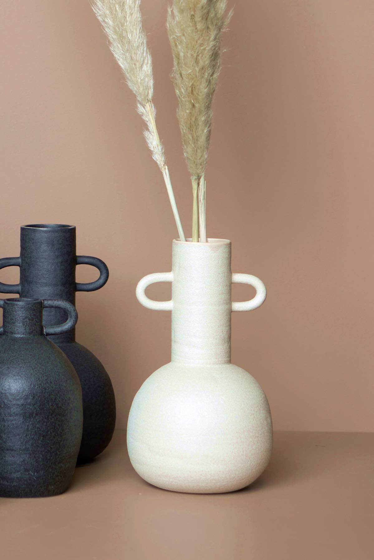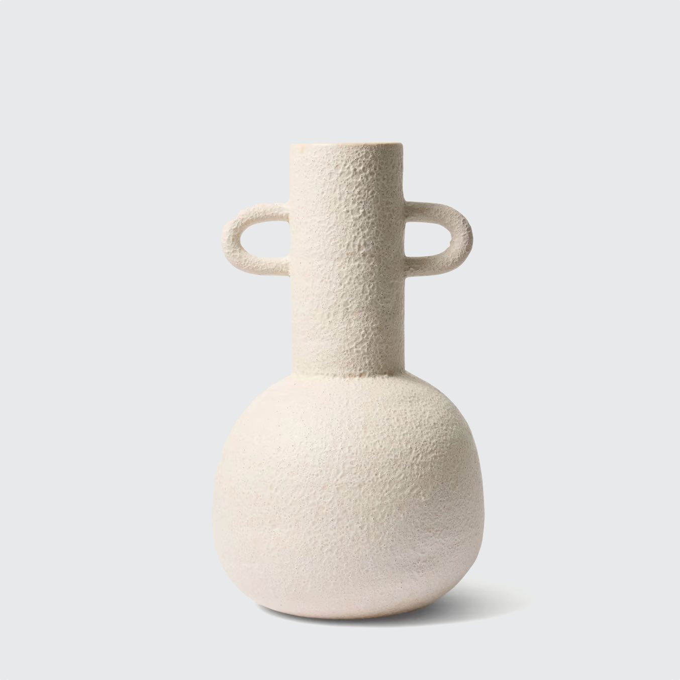 The Long Vase in sandy mole color features a gorgeously rounded shape with a long, narrow neck. Two handles on either side stand as nice decorative details while also making the vase easier to move.