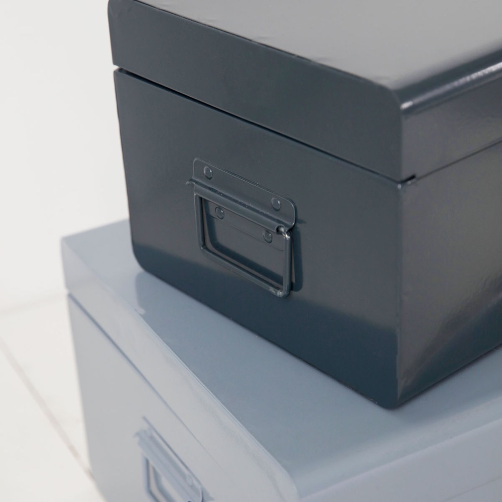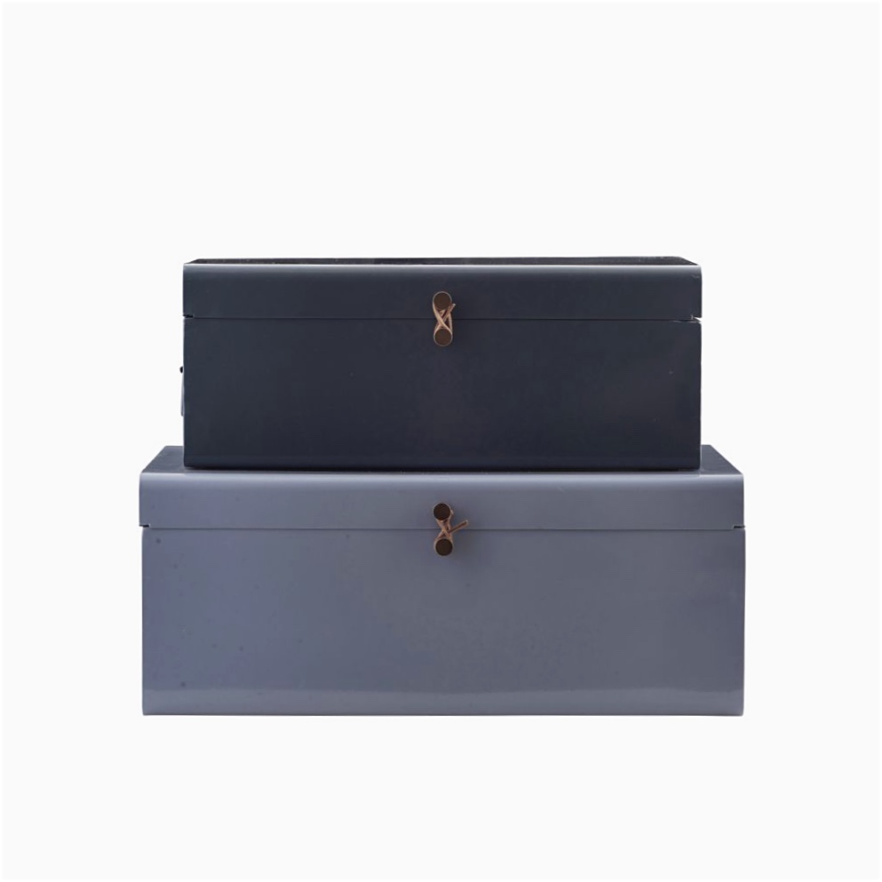 Beautiful metal suitcases ideal for the modern home as a storage solution for toys in the playroom, magazines, office supplies or other small bits that should not be lying around. Both suitcases are closed using a small leather cord that is that little extra detail and is also a nice contrast to the steel. They are handmade so small irregularities will appear in the surface, adding to the character of these charming items.