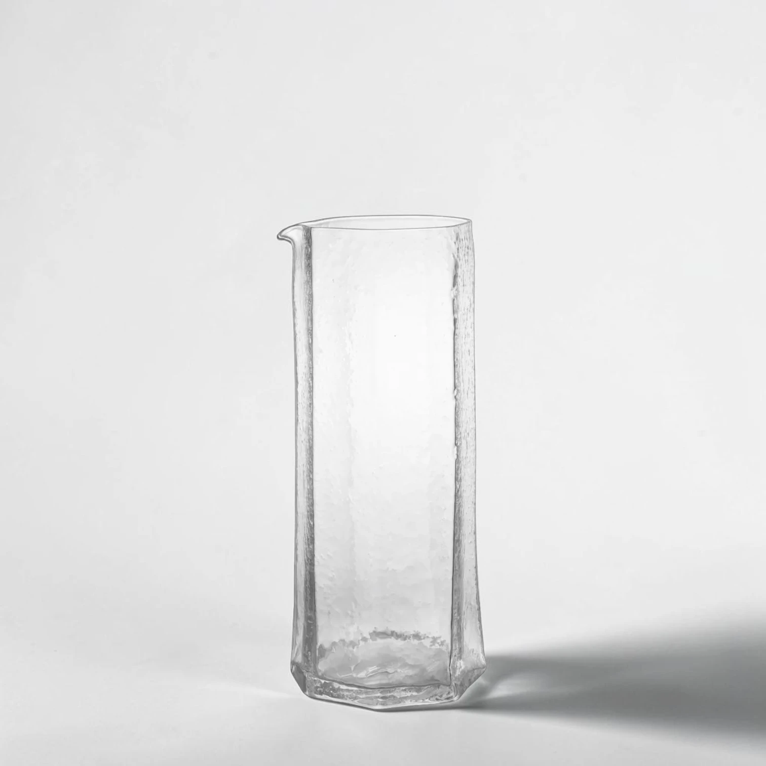 The Kiru carafe is designed for serving water, juice, or wine. It is mouth-blown from 100% recycled glass and crafted using the Japanese Kurinuki technique, where forms are first hand-carved in clay and then translated into a brick mould. This process presses the ceramic texture into the glass, giving each clear glass carafe a unique, handcrafted finish.