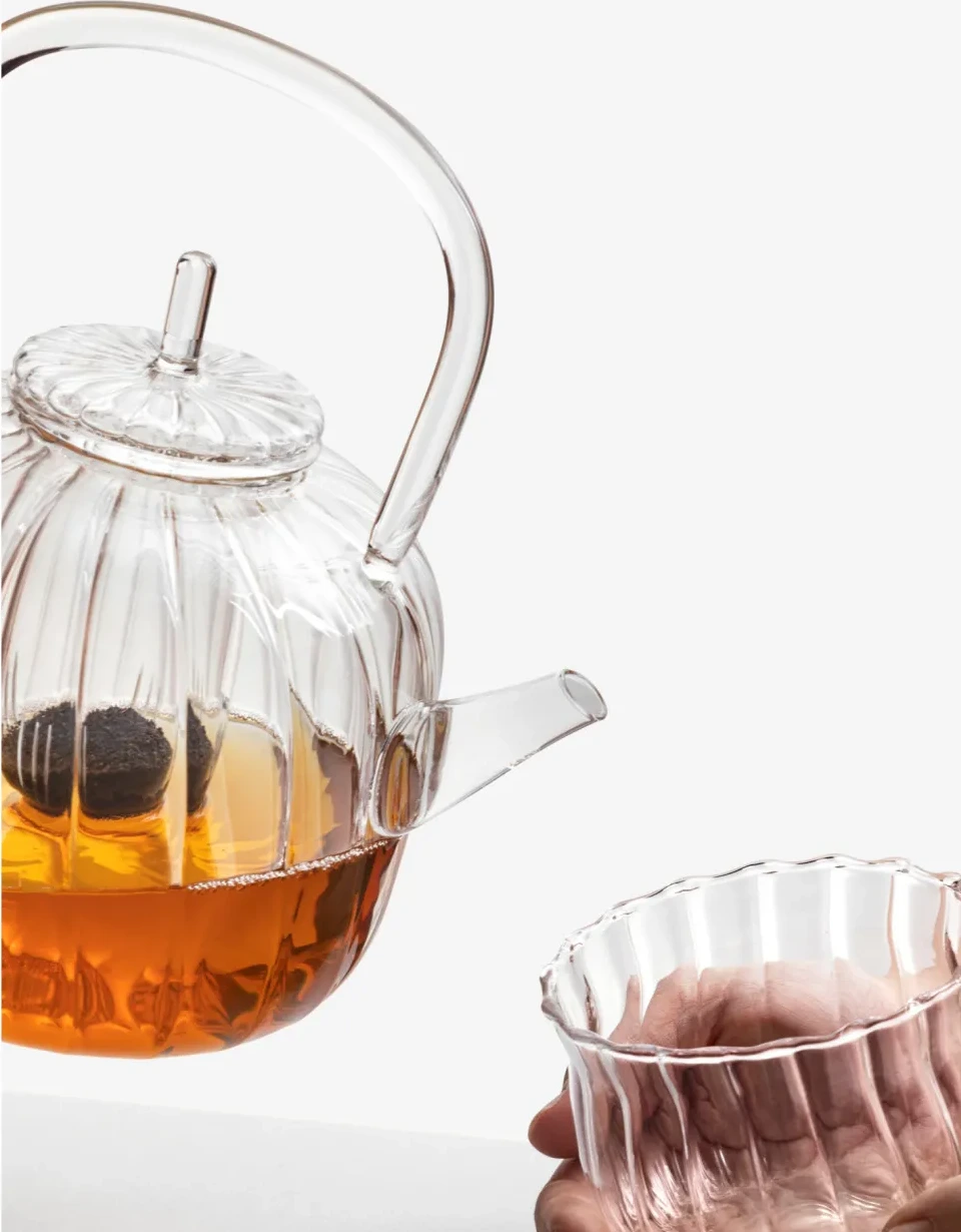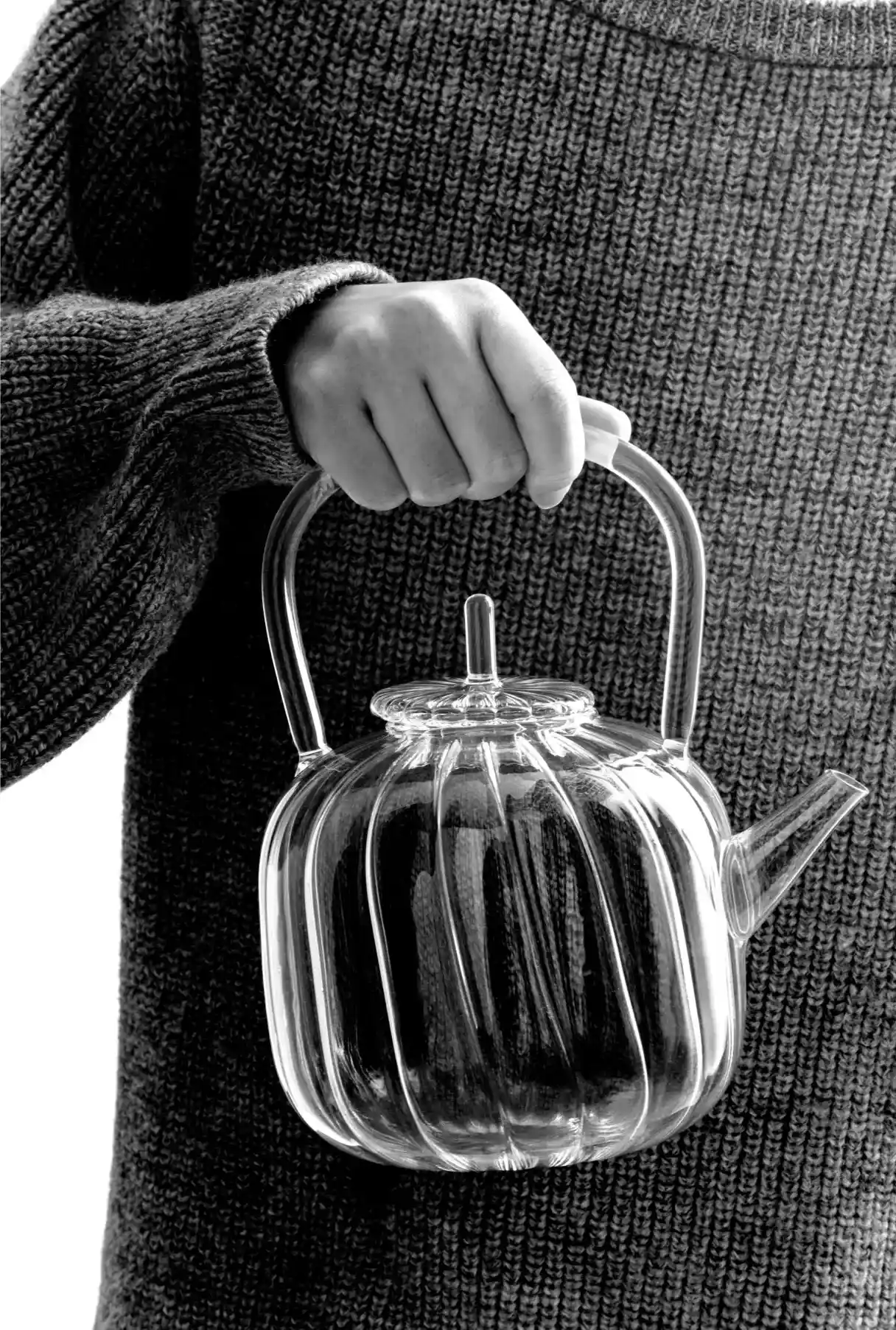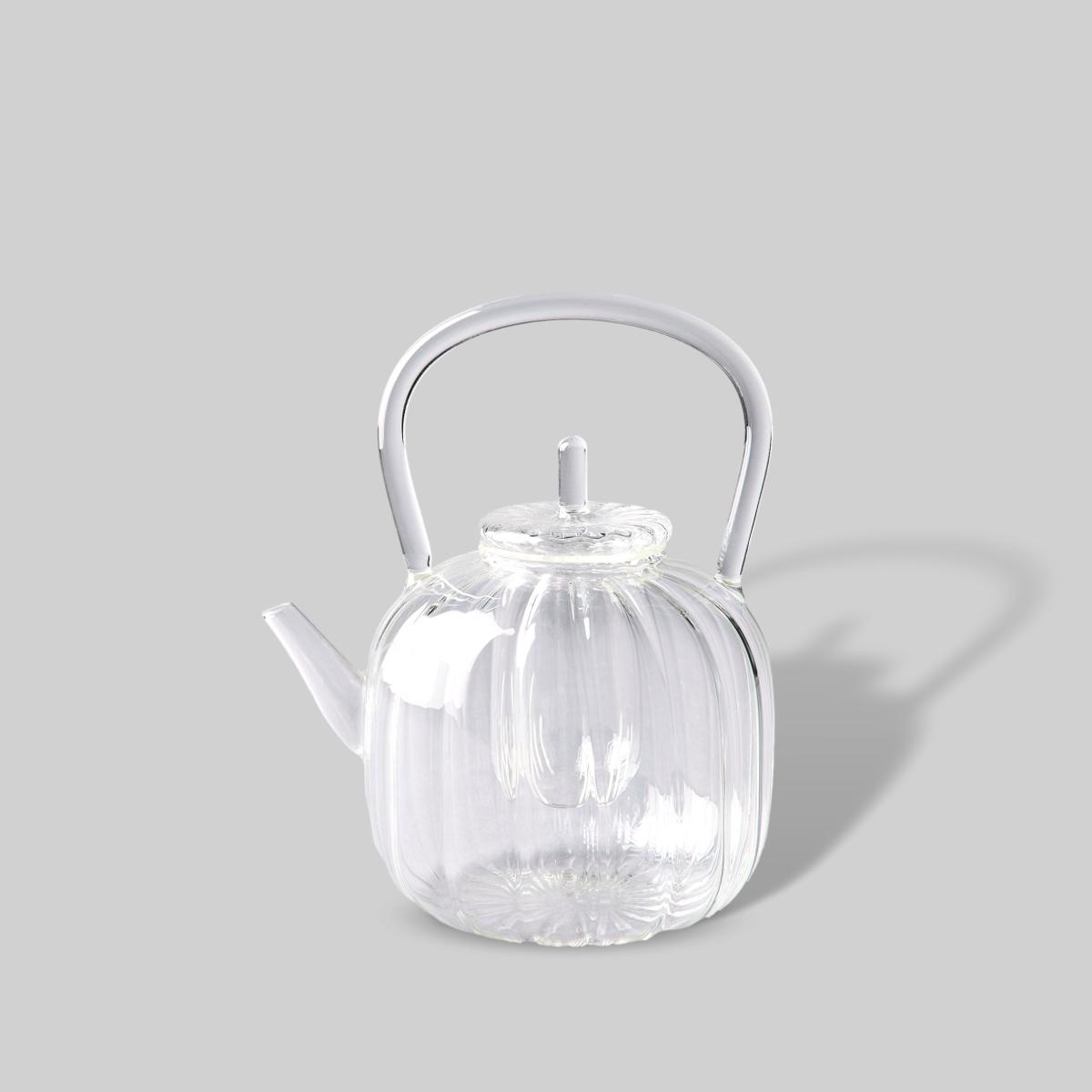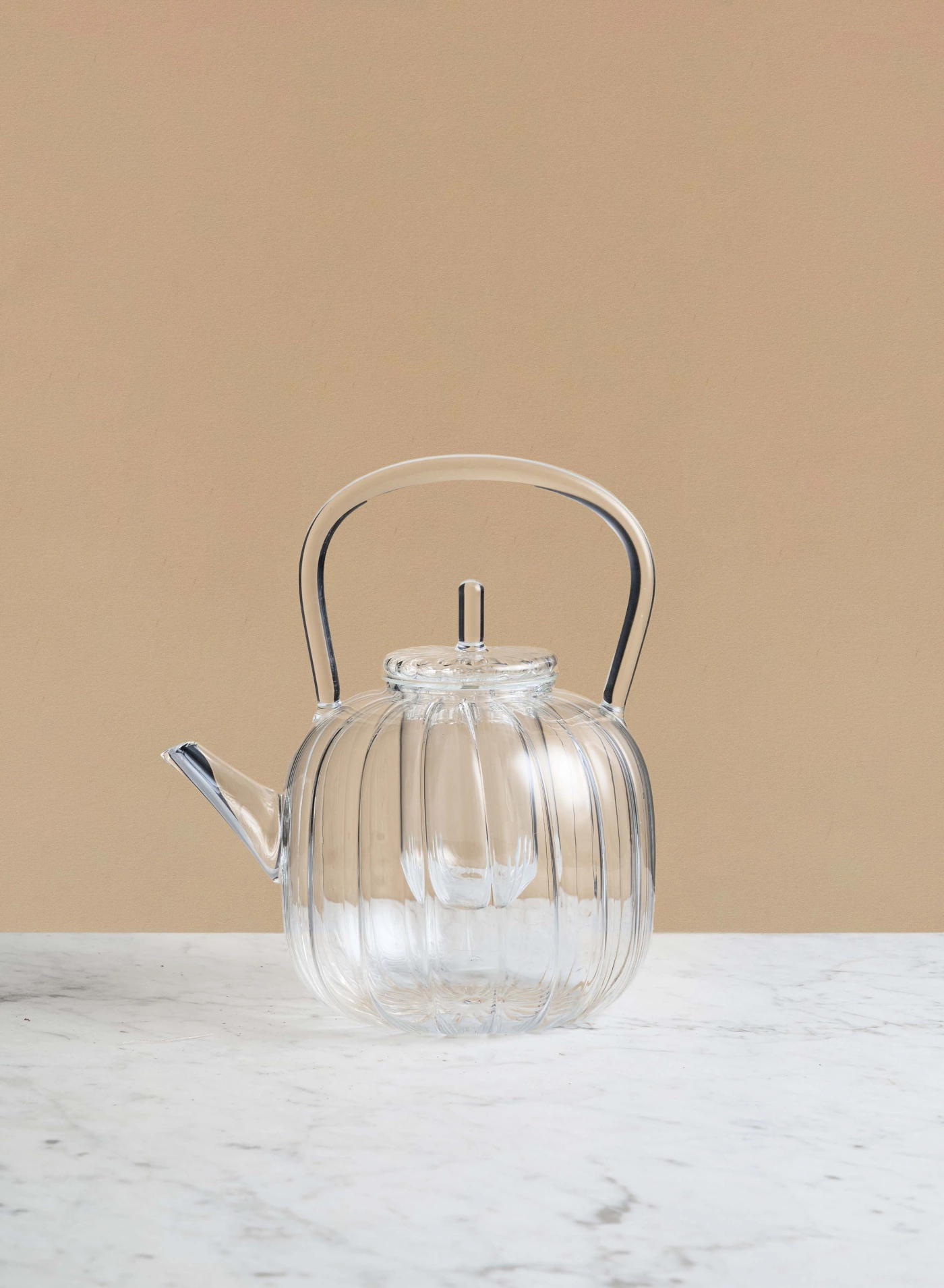 Inspired by Japanese tea ceremonies called Cha-No-Yu this beautiful teapot is crafted from borosilicate glass using the lamp work technique. Its body is wholly made from clear glass featuring an elegant shape and lined details. The teapot comes with a matching lidt and a glass filter.