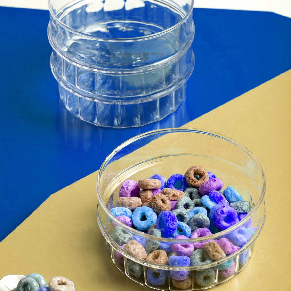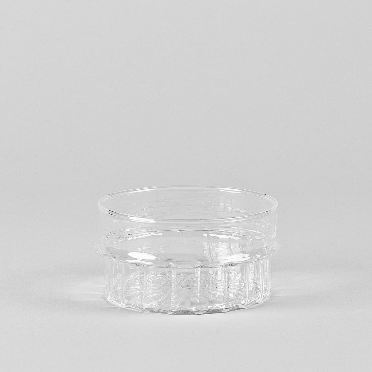Crafted from borosilicate glass and using the lamp work technique, Transit collection defined by two elements: one smooth and one with a striped interior. With placing together all the collection pieces, a landscape of different heights appears and a light weave between the decorative and the essential world. The horizontal edge, at the point of joining of the two different profiles allows the overlapping of the elements and become an anti-slip for the hand.