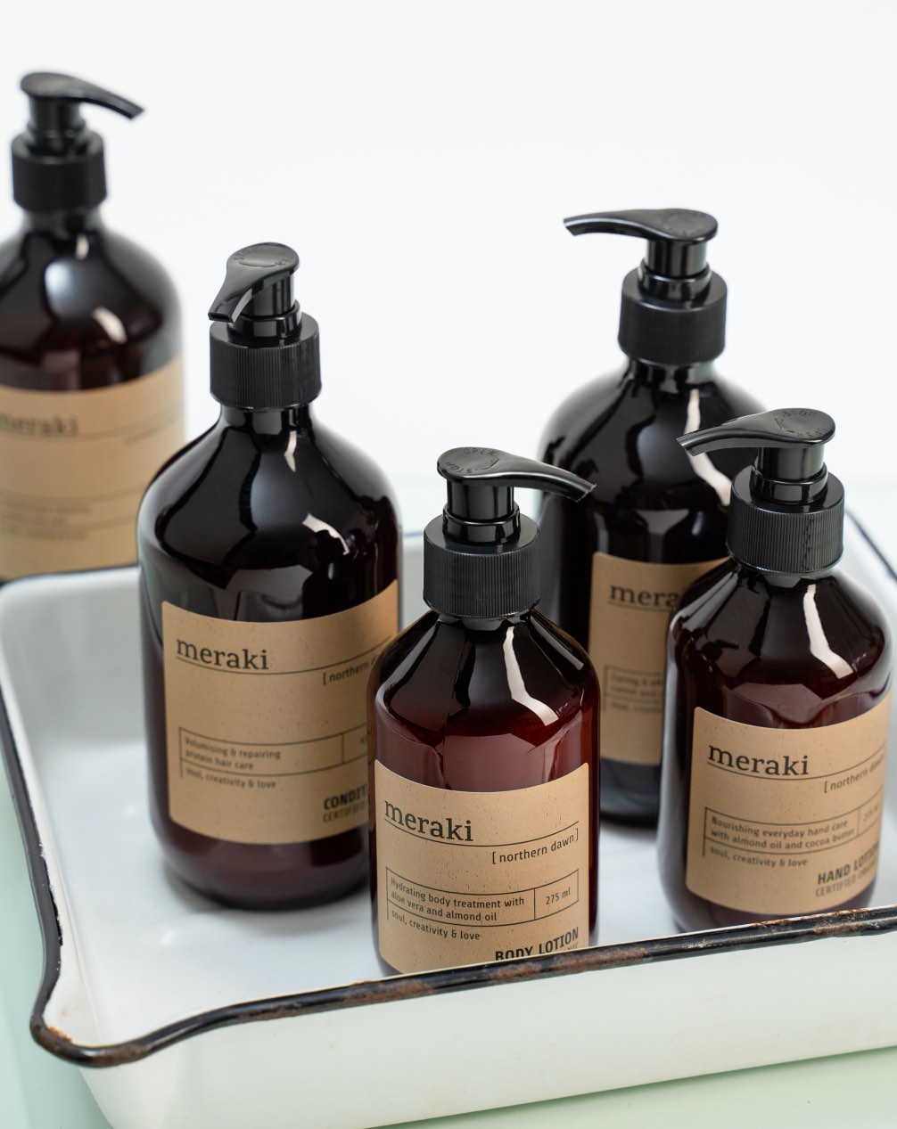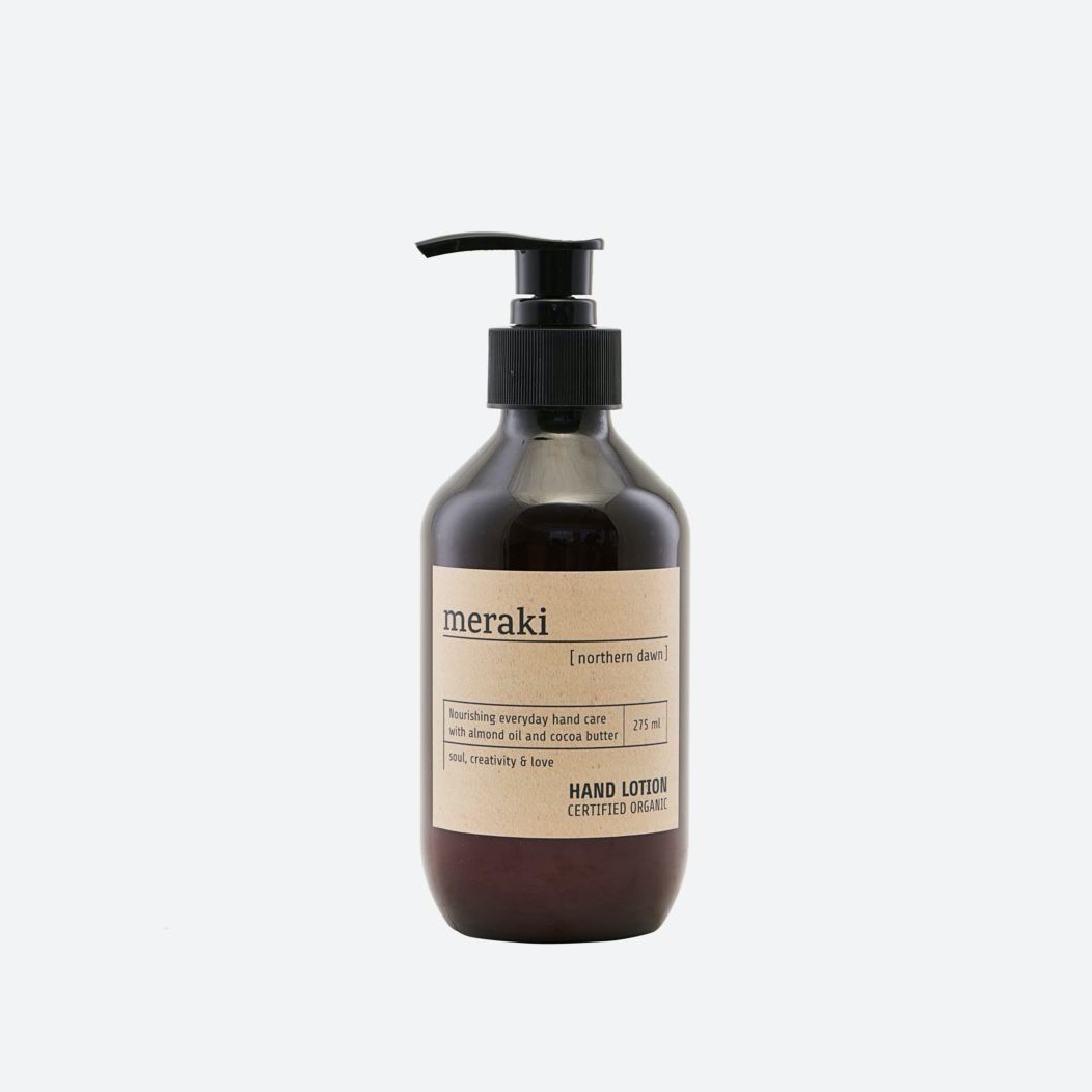 it contains organic aloe vera, almond oil and cocoa butter which care, moisture and soften the hands – without being greasy. Use the hand lotion after doing dishes or when the hands need extra care. This fine hand lotion comes in the most beautiful wrapping which will add a decorative touch in the home. Put it on a tray together with a hand soap in order to create a simple and pure look.