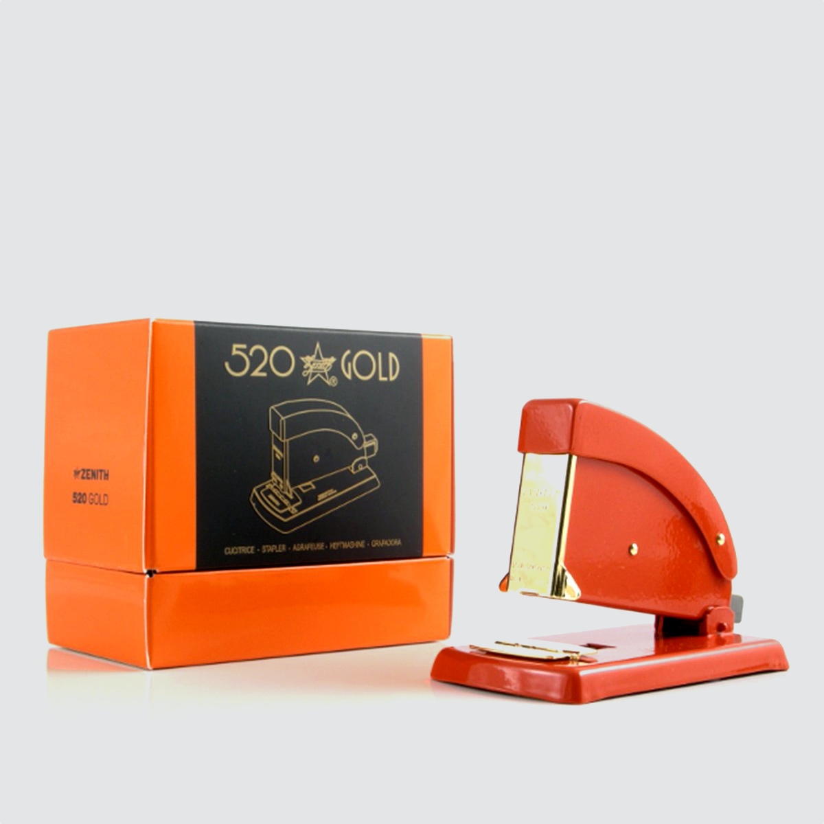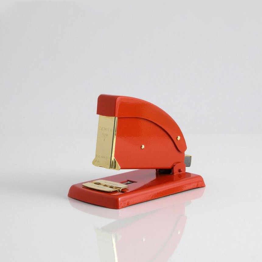520 gold is a strong well-made stapler made entirely from metal. For this special edition it is painted with lead free enamel in red, that resists wear and corrosion and decorated with 23 carat gold plated details make this an elegant-looking, stylish tool on your desk.