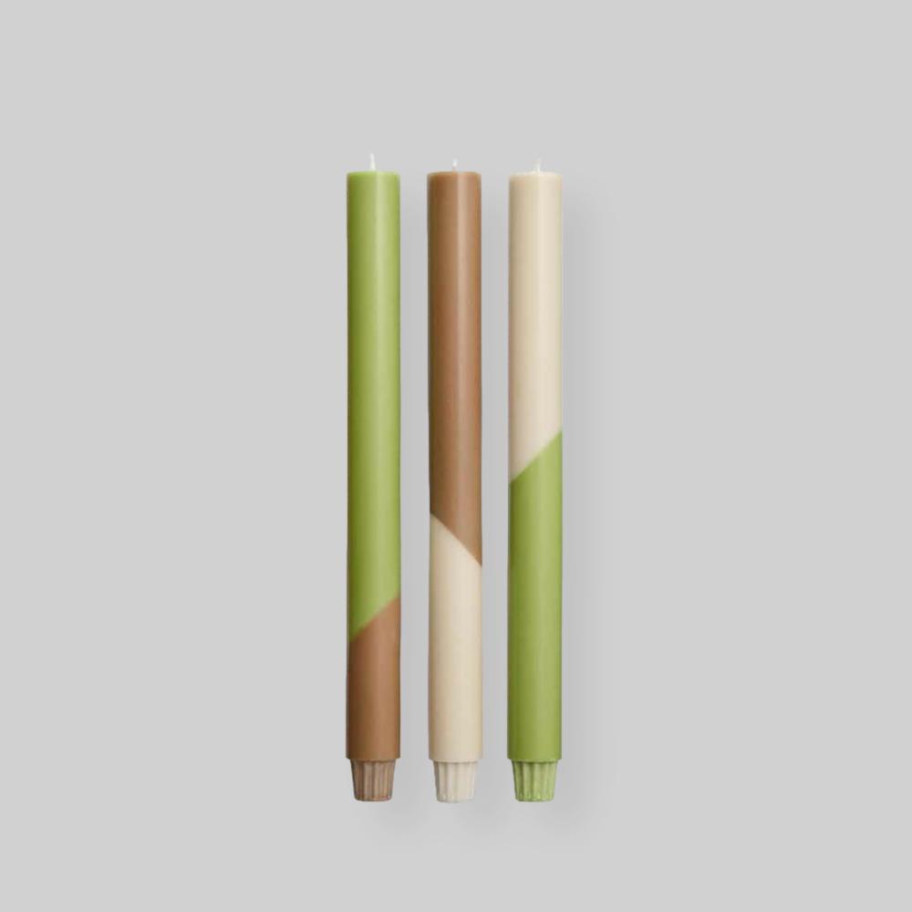 The Diagonal candles come in a set of 3 long candles with a stunning color assortment. Stearic acid (plant-based and certified) is the most sustainable wax as it doesn’t contain any chemical, synthetic, or animal-based reagents and the palm is a highly efficient crop. Each candle is handmade from RSPO certified plant-based wax which is melted in a specially designed kettle. The melted wax is poured by hand into iron molds. Once the candles are hardened, they are sculpted to the right size and a crown is applied using simple machines. The candles are unscented and non-toxic.
