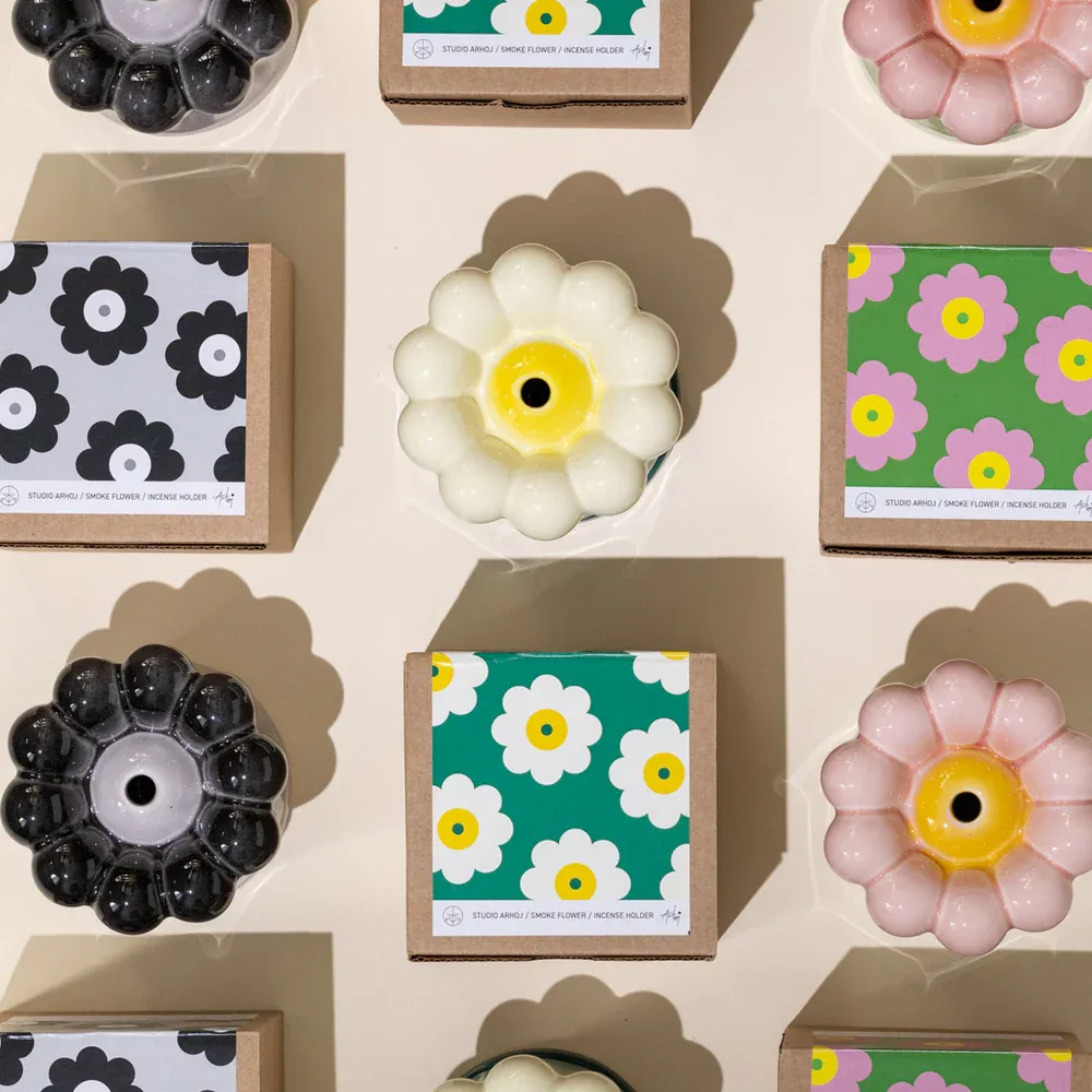 The Smoke flower is hand cast in earthenware and sprayed with multi coloured glazes. No two are 100% alike. The Flower holds both incense logs and sticks, making it not only beautiful but multifunctional.