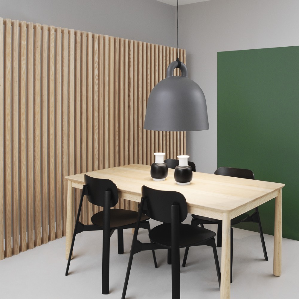 The expression of Bell is robust, the form is simple. The contrast between the materials creates a contemporary look. The white inner side reflects the light, which falls like a cone and provides practical lighting over, for example, the dining table.