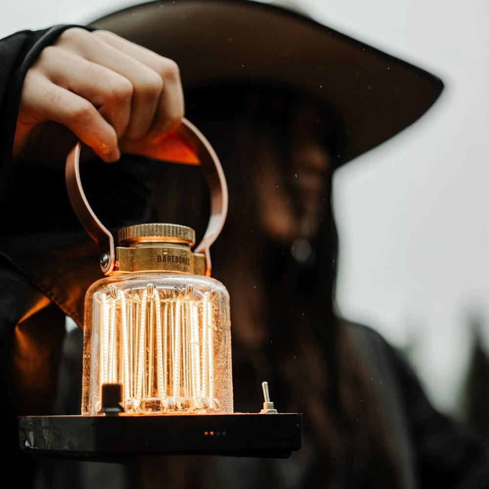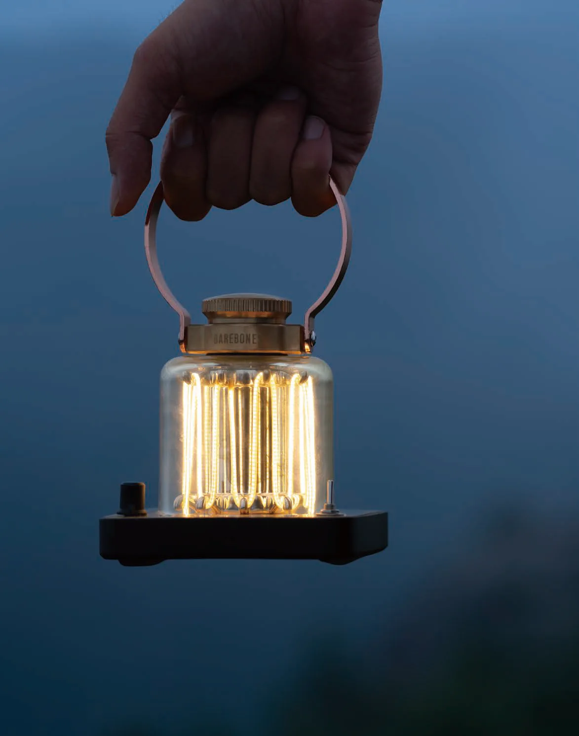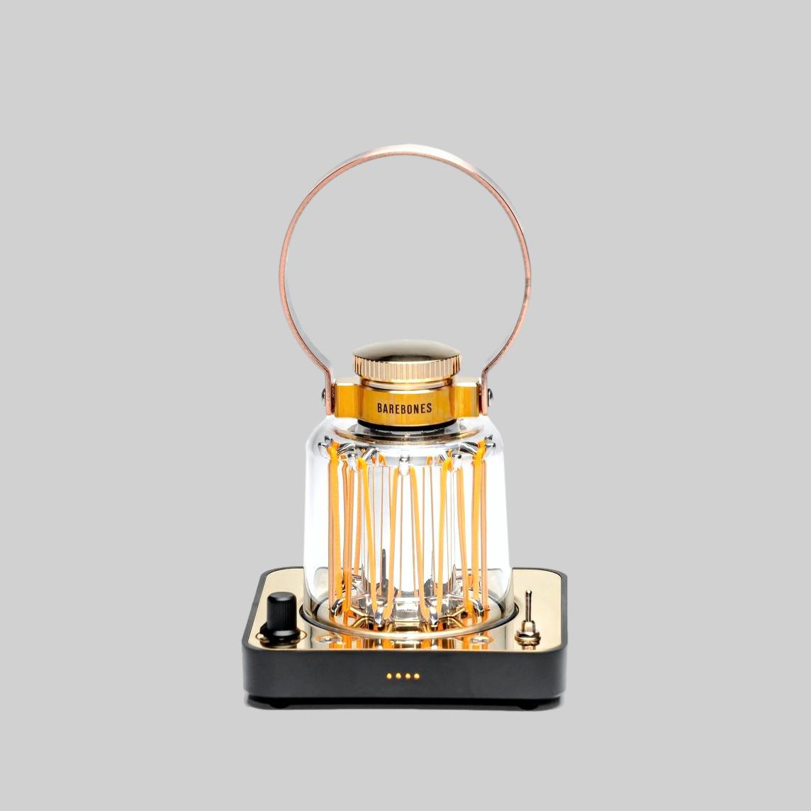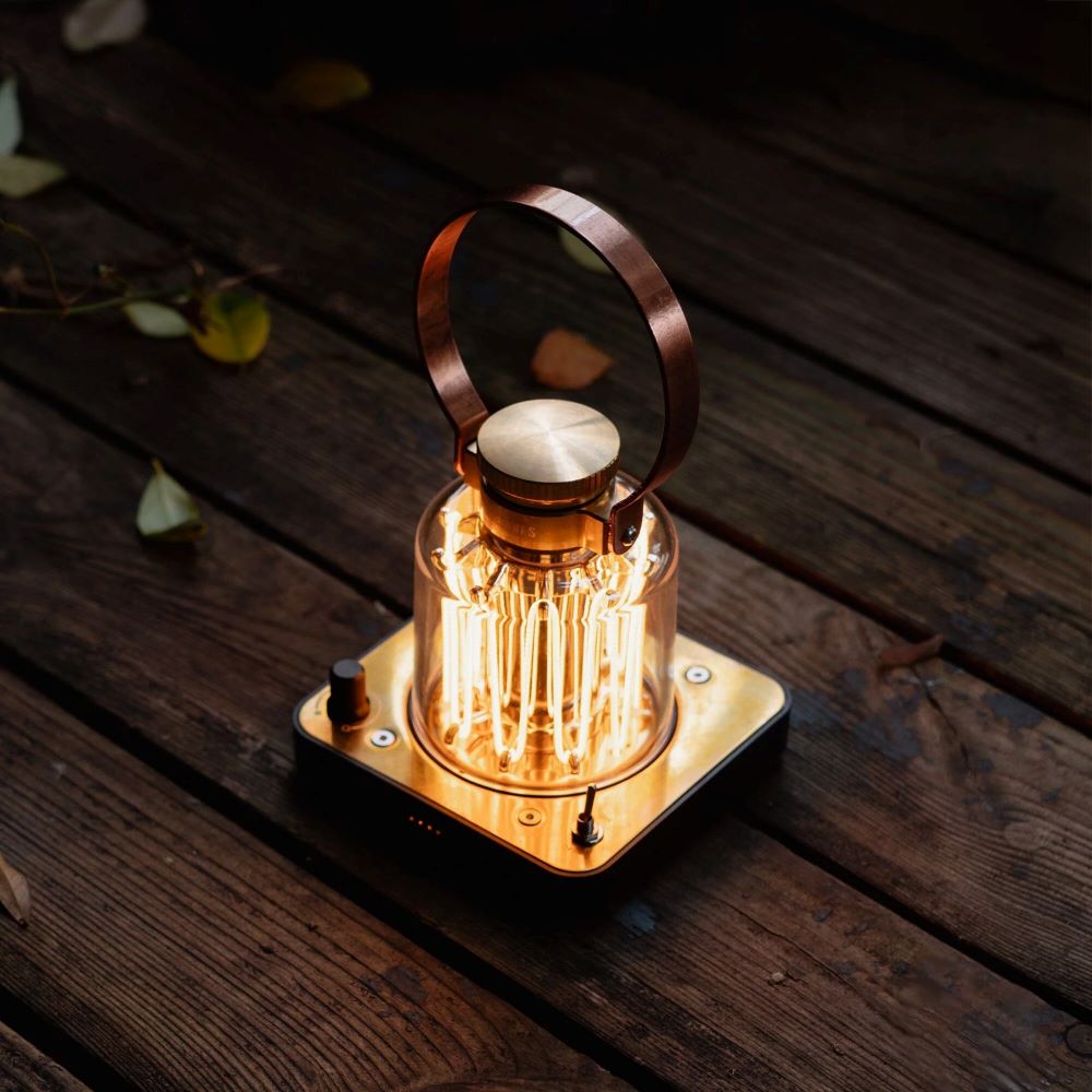 A completely unique, vintage-inspired rechargeable lantern. Beautiful LED wires emit a soft warm glow under the durable curved lens. A large copper finished handle allows for easy movement from place to place. Polycarbonate lens, brass baseplate for an elegant and durable aesthetic. Vintage toggle switch for a classic touch and intuitive control and dimmer knob allowing adjustment of the light intensity according to individual preferences.