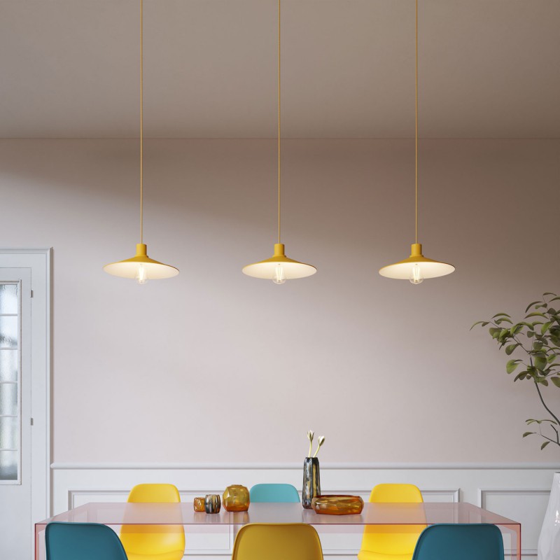 Iconic and simple, it is a concave plate lampshade, ideal in big open rooms such as kitchens or in a bar or restaurant, but it wouldn’t be out of place outside either.